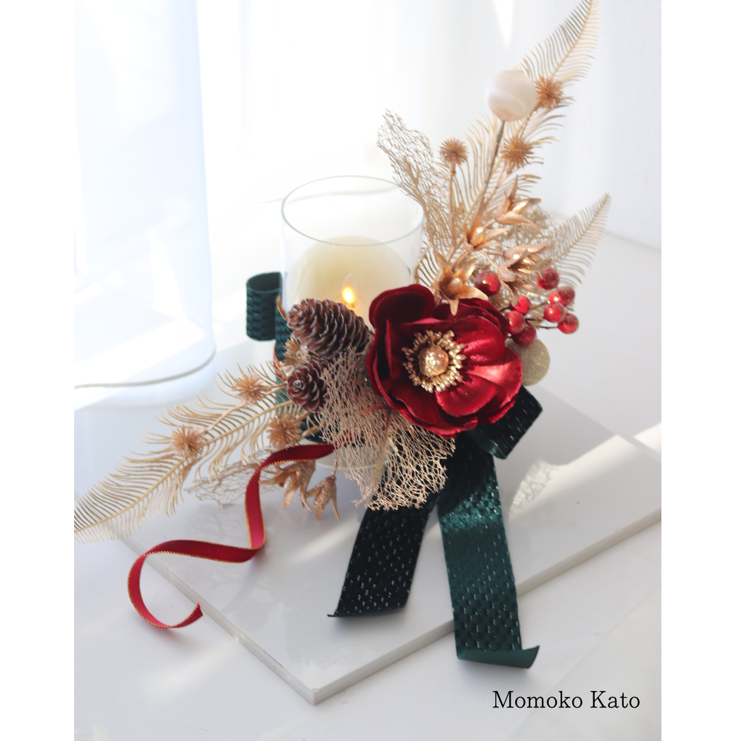 ベルベット素材のアネモネの花やリボンを使い、リッチで暖かみのあるクリスマスをイメージしました。ご覧いただく皆さまに幸せなクリスマスが訪れますように…