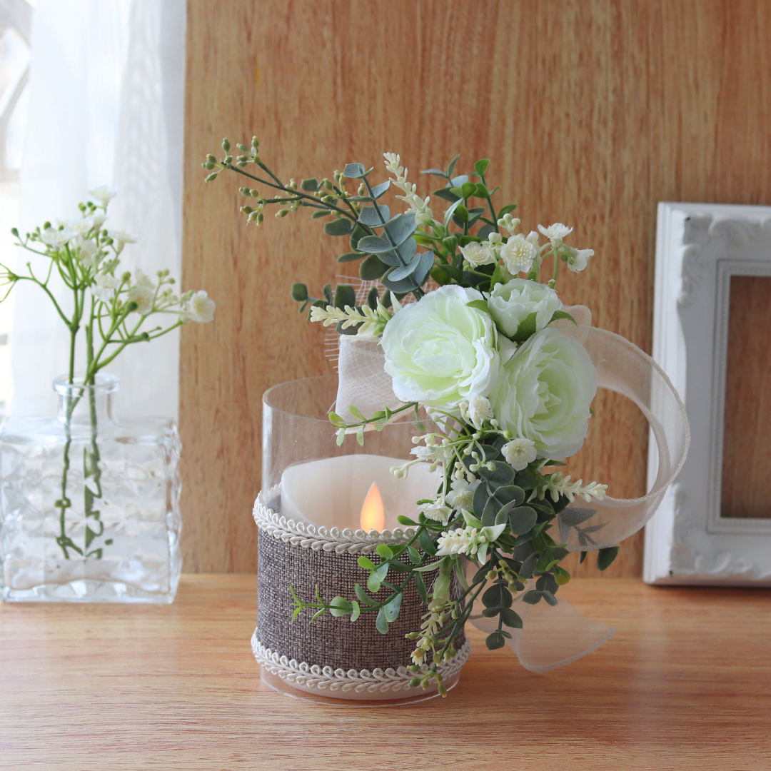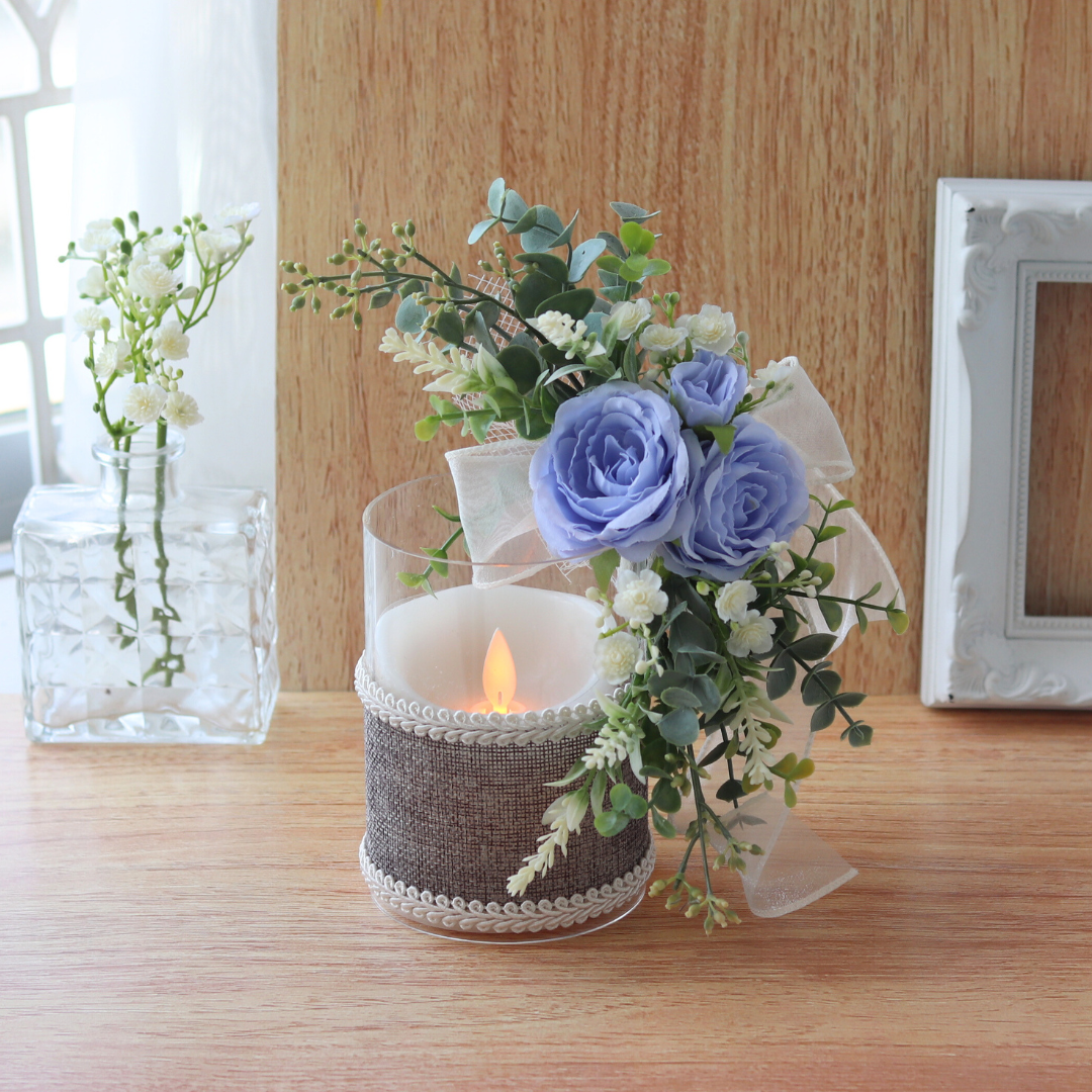 ユーカリやローズなどの花々と、やさしい灯りのLEDキャンドルを組み合わせた